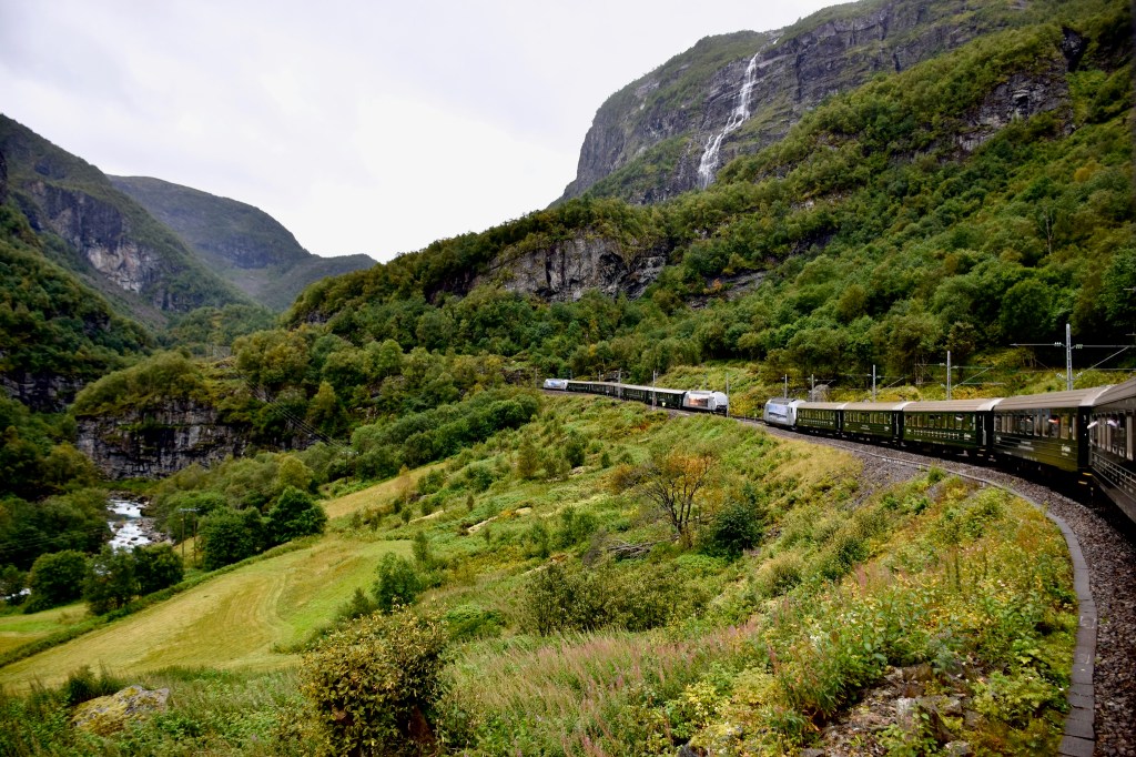 - Una de las rutas más espectaculares de Europa, cruza fiordos, túneles y montañas nevadas. El trayecto Flåm → Myrdal (20 km, 1 hora) asciende desde el fiordo hasta 867 m sobre el nivel del mar. El paisaje incluye glaciares, ríos, gargantas, cascadas y más de 20 túneles. Con deciros que la ruta ha sido citada por Lonely Planet y National Geographic como una de las más bellas del mundo.